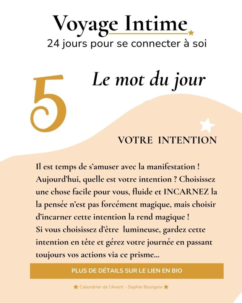 Voyage intime, c’est 24 jours pour plonger au coeur de vous ! Je vous invite dans mon nouvel univers, fait de voyages intérieurs, de découvertes, d’émotions, de rire, de défis et de magie ! 24 jours pour voir autrement notre environnement et devenir acteur de son parcours.